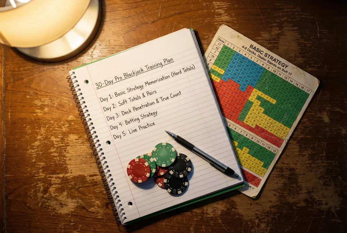 Thirty days is enough to build a professional-grade basic strategy foundation and bankroll management habits. Advanced techniques like card counting require significantly more time. The 30-day goal is live-table competence not counting or team-play proficiency.